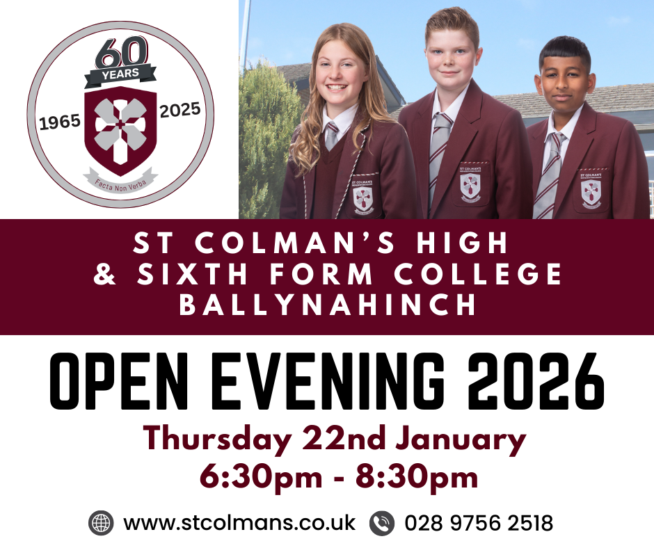 St Colman’s High & Sixth Form College is excited to announce our upcoming Open Evening on Thursday 22nd January 2026. This special event will offer prospective Year 8, along with their parents, a unique opportunity to experience our college through an engaging and informative tour.